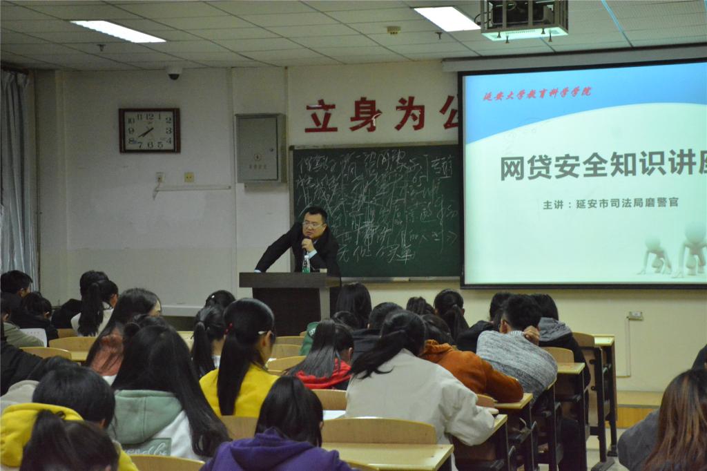 11月8日晚7:00,我校教育科学学院于5308教室举办“网贷安全知识讲座”,本次讲座的目的在于让同学们认清网络贷款真相,保护自身合法权益不受侵害。延安市司法局人民调解协会副会长兼秘书长磨建伟主讲,教科院大一全体新生参加此次讲座。