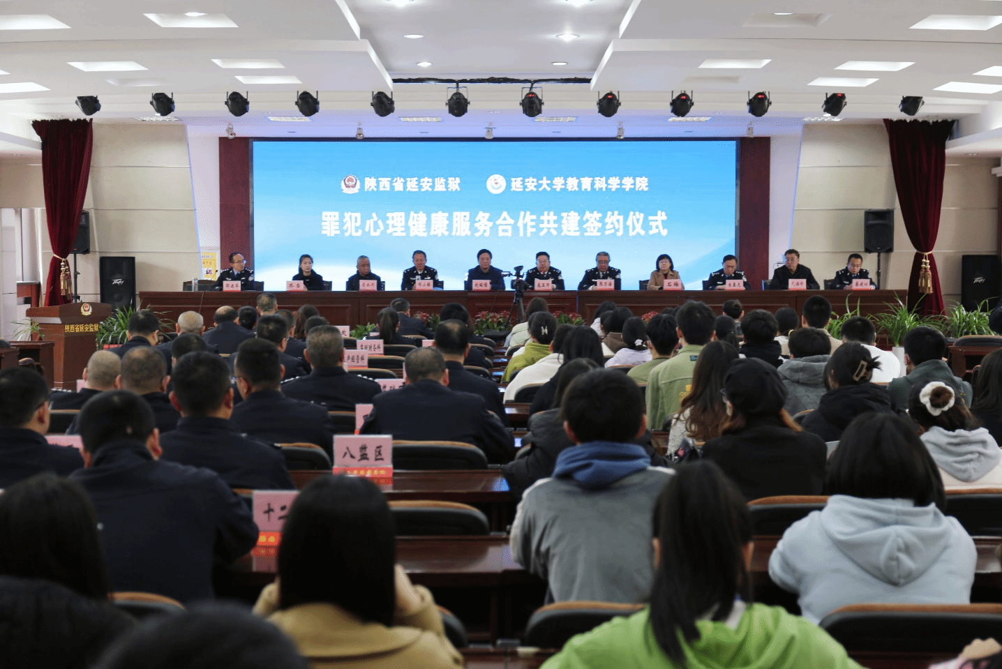 2023年4月24日下午,我校教科院与陕西省延安监狱合作共建协议签约仪式在延安监狱举行。我校教科院院长刘瑞儒,心理咨询中心主任石梅,心理系主任符永川,原教科院副院长武海明,教科院辅导员乔雪及心理学专业20级全体学生;延安监狱党委书记、监狱长高玉开,党委副书记、政委张万海,党委委员、副监狱长邓小林、朱春光、邵建华,监狱企业副总经理蔡建功及延安监狱部分中层领导和干警近百人参加了签约仪式。签约仪式由邵建华同志主持。
